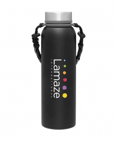32 oz double wall 18/8 stainless steel thermal bottle with copper vacuum insulation, insulated stainless steel threaded lid, silicone ring, removable strap with buckles, removable clasps, and powder coated finish. Individual gift box. Hand wash recommended. Do not microwave. Complies with FDA, Prop 65. 11" H x 3.1875" W