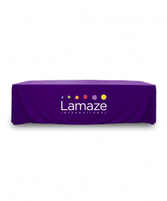 8 ft. Premium PolyKnit throw table cover with one color logo. Fits a 96 inch wide x 30 inch deep table. All corners are rounded meaning they will not gather and lay on the floor. Floor length on 4 sides. This cloth requires no ironing, is EasyCare machine washable and dryer safe.