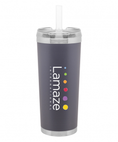 24 oz double wall 18/8 stainless steel thermal tumbler with copper vacuum insulation, stainless steel rim and base, threaded Eastman Tritan lid, snap closure, straw opening, and flexible wide silicone straw.